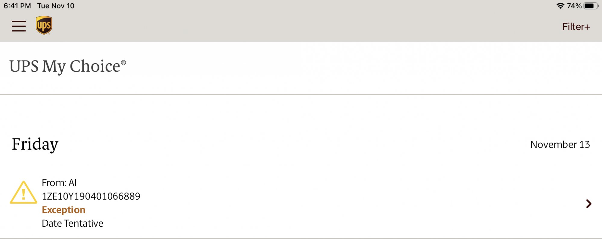 I have this also. (9:20, sitting in China) And only see it on this UPS app I downloaded, nothing mentioned in my desktop UPS My Choice. Still states I will be getting this 11/13.UGH... The ‘Exception’ is back. It went away on Saturday, and now it’s back. WHY!?!?