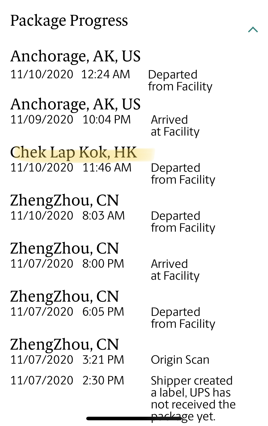 My 9:20PM Pro Max 256GB Pacific Blue just departed ZhengZhou at 11:21 AM 11.11.20. My other Pro Max 128GB Graphite is already presumed to be already in Kentucky since it's last scan was around 12 AM 11.10.20 departing Anchorage, Alaska.
