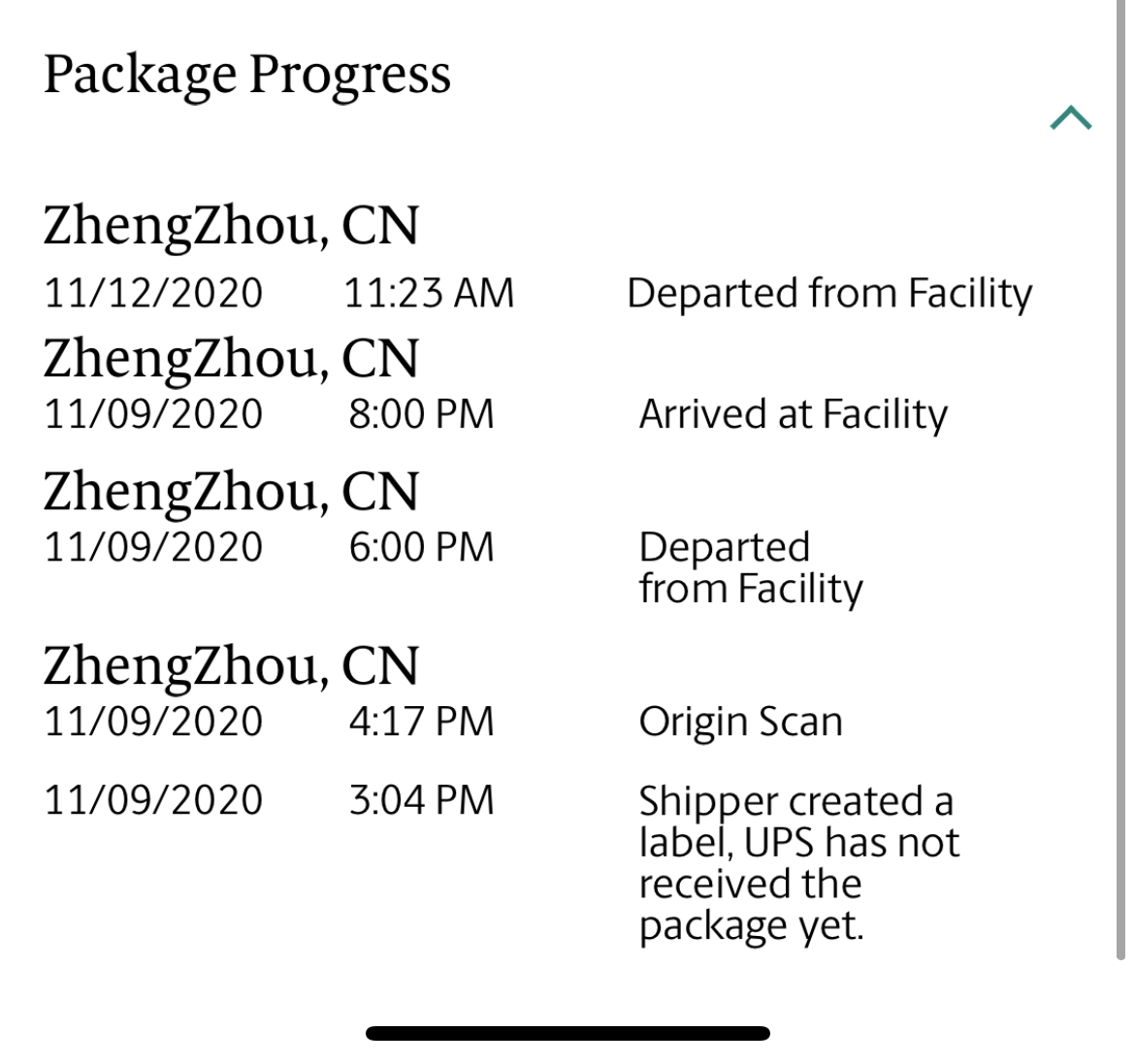 | In Transit | 11/12/2020 11:23 A.M. | ZhengZhou, China | Departed from Facility |