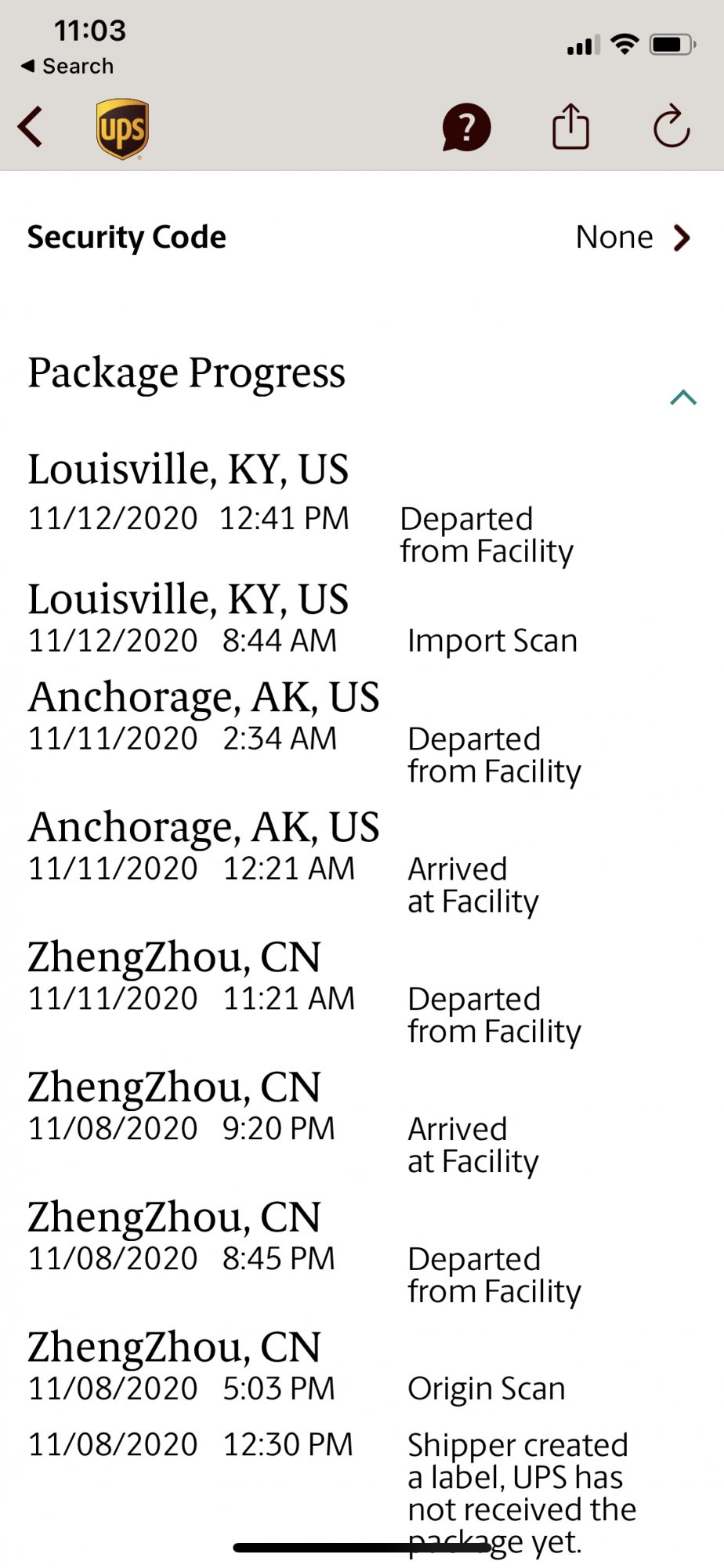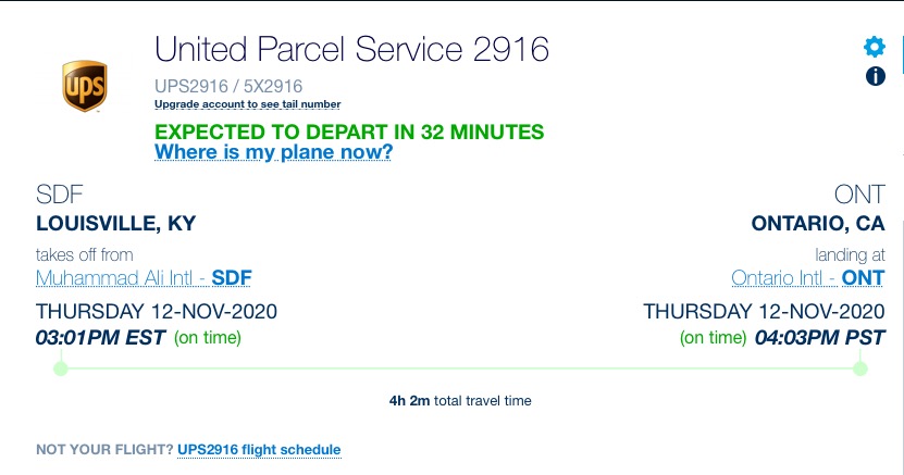 I see. I had my departure scan from Kentucky at 12:41 PM EST. Either those of us with early scans are held at the airport, of they're using a trickle effect into Ontario (I'm on the LA/OC boarder)I am in socal long beach, didnt get a depature scan. My watch left louisville aroud 3am est last time straight to LA and i am expecting the same with my phone.