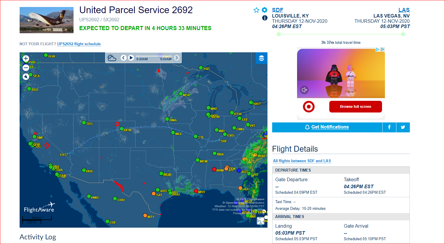 There is a UPS FLIGHT scheduled in 4 1/2 hours to Las Vegas, Nevada. If I do get an Import Scan within 4 hours I will be on that flight otherwise I will be catching a flight at mid night and it will be arrive tomorrow morning at 4AM.