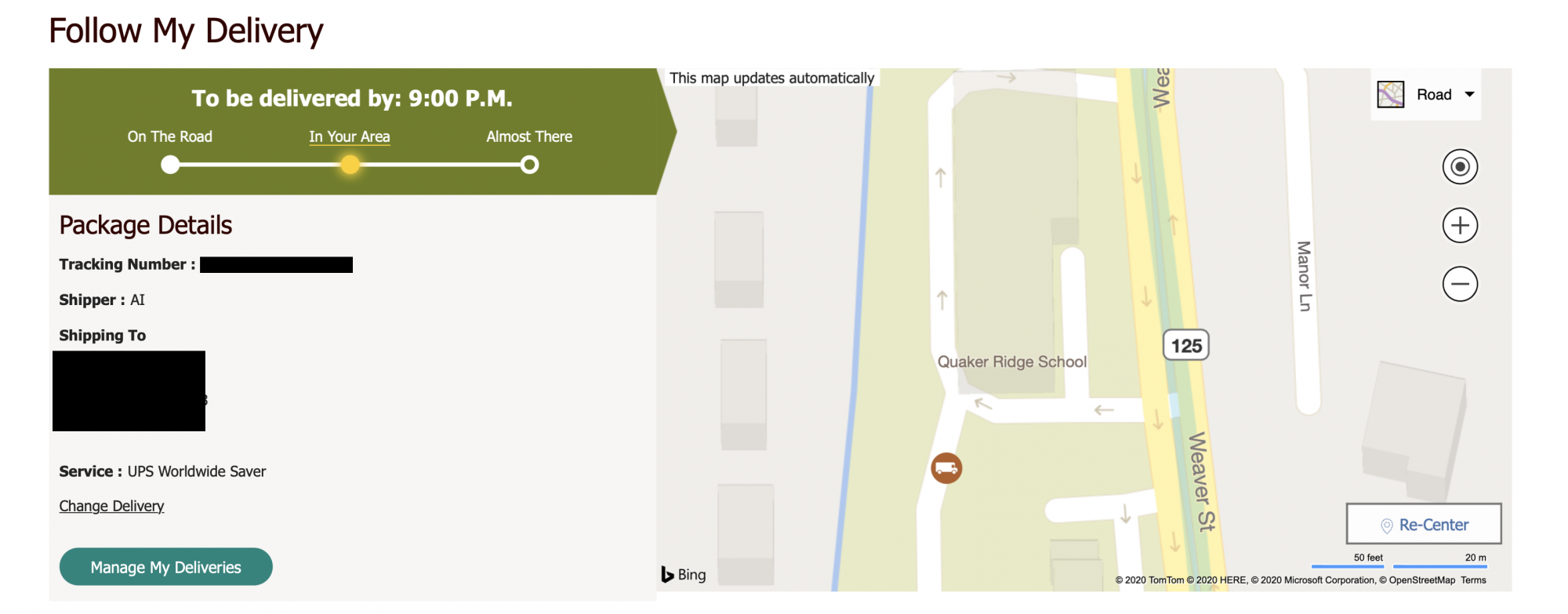 30 minutes later, it's still at the same damn school. Lots of offices they're dropping off to it seems...Oh no, my UPS driver stopped at an elementary school. This could take a while.