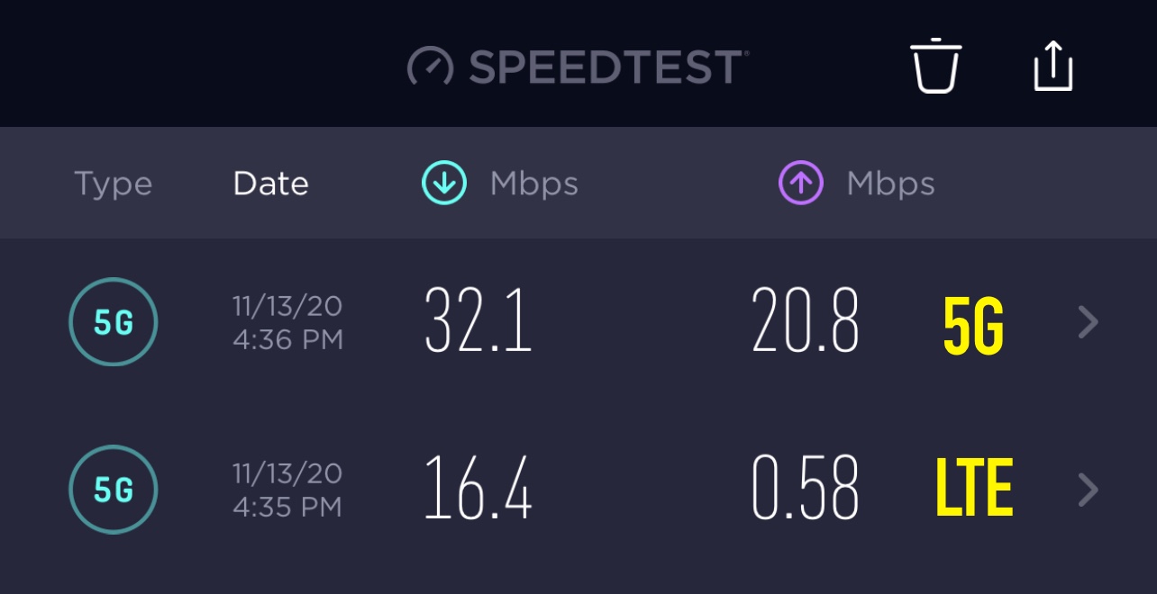 I wanted to comment specifically on the 5G support. I knew going in that 5G wasn't offering much in the way of faster speeds in most places. I'm on T-mobile where they don't really have any mmWave anywhere yet so I wasn't expecting much. However, I am seeing significantly better speeds around where I live than I see on LTE. Here's a comparison of the kind of speeds I get: