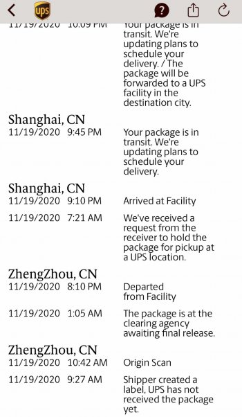 I ordered my iPhone 12 Pro Max when preorders opened, and it was supposed to be delivered by UPS on November 13th. I waited home all day for the package. There were other UPS packages delivered to my address earlier in the day, but not the phone unfortunately. UPS assured me that the phone was still out for delivery and would be delivered by 9PM. At 9:01 PM, the status for the phone changed to 'delivered', but the package was not outside of my front or rear doors. There was no knock on the door, and my doorbell camera didn't alert me of anyone's presence/detected motion at that time. Needless to say, UPS didn't deliver the phone to me. Apple opened an investigation and sent me a replacement phone. It was mailed on Nov 19th (and I immediately requested UPS to hold it for pickup from the nearest customer care center), but it has been stuck in Shanghai since then. There hasn't been a physical scan since the 19th. I called UPS today, and they told me to have Apple open an investigation since it's been more than 3 days without a physical scan. Apple has the expected delivery day as tomorrow, and they can't open an investigation until 3 days after the expected delivery day. Anyone else having the same issue with their package being stuck in Shanghai since the 19th?