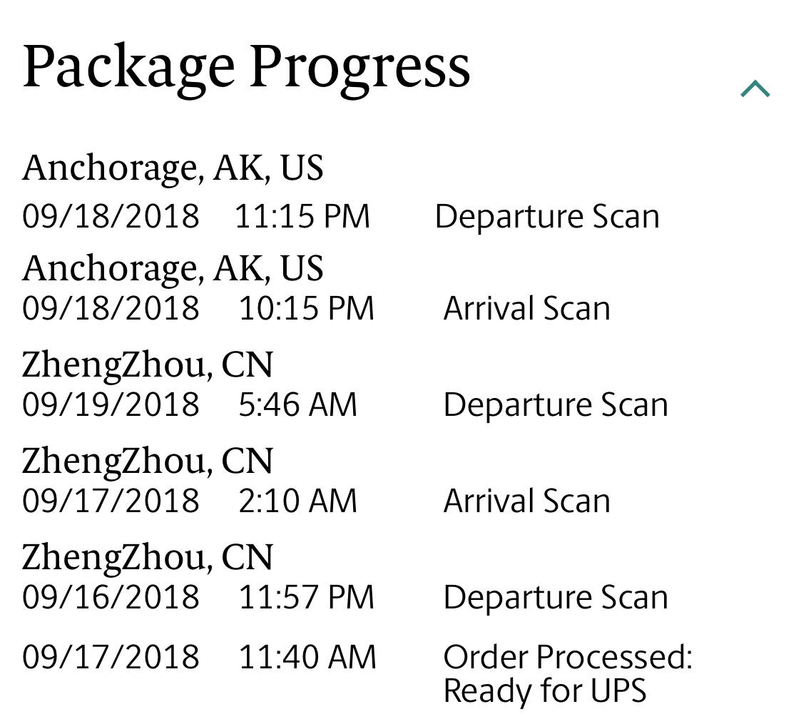 China 09/17/2018 11:34 A.M. Order Processed: Ready for UPS
