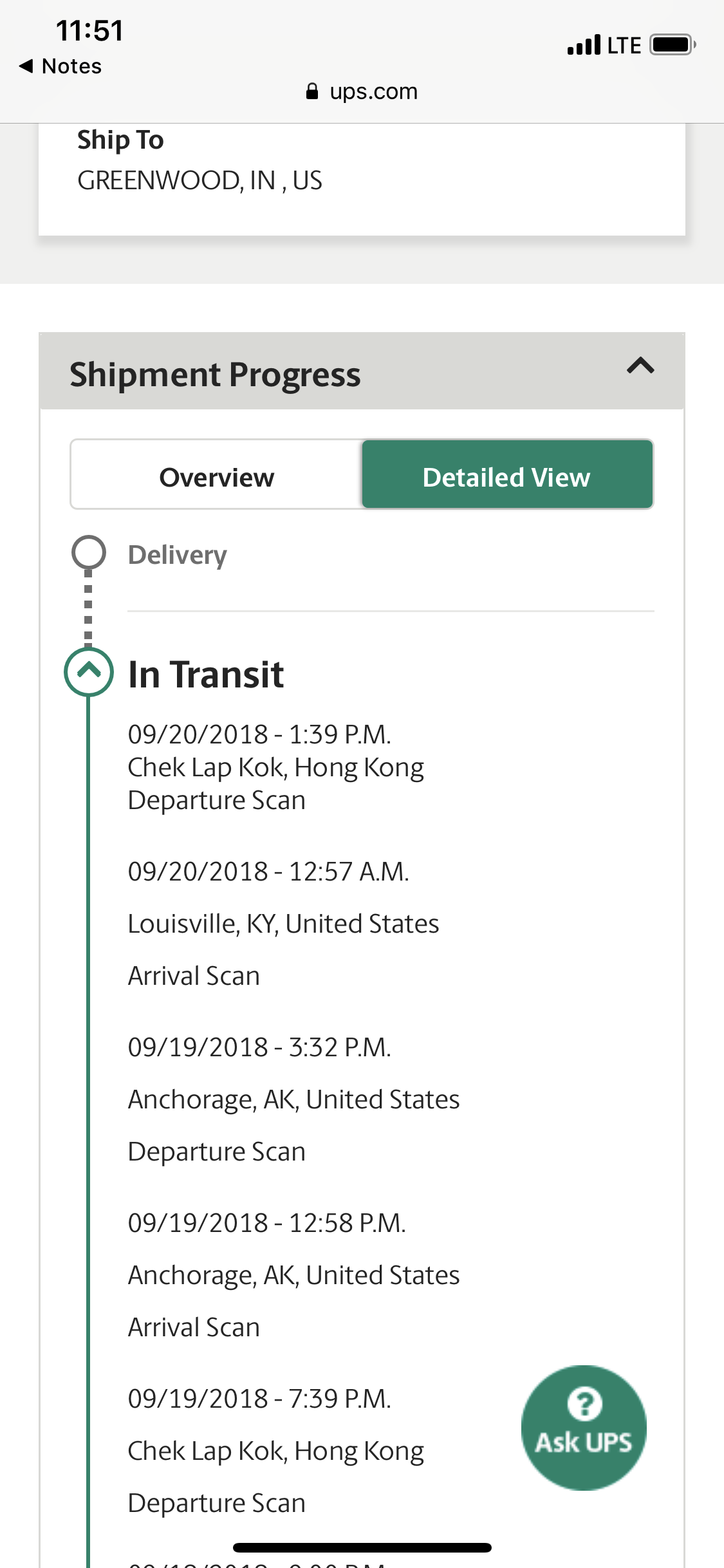 So here is my theory. The 3:46 “In Transit” scan from yesterday is when the phones actually started moving. By now they have landed in AK, but after refueling the plane it just went on it’s way to KY. So if there was no physical scan in AK, then there would be no inciting action till it lands in Louisville. I think that once it landed there they scanned the palettes and that triggered a departure scan from Incheon with today’s date. Now they are sorting and getting ready to put them on planes to our local hubs for this afternoon, so they can get them in trucks for tomorrow morning. If my theory holds true later this afternoon we will get rapid fire scans getting them all the way to departing Louisville.