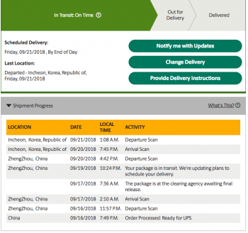 China 09/16/2018 6:36 P.M. Order Processed: Ready for UPS