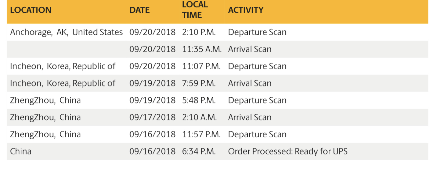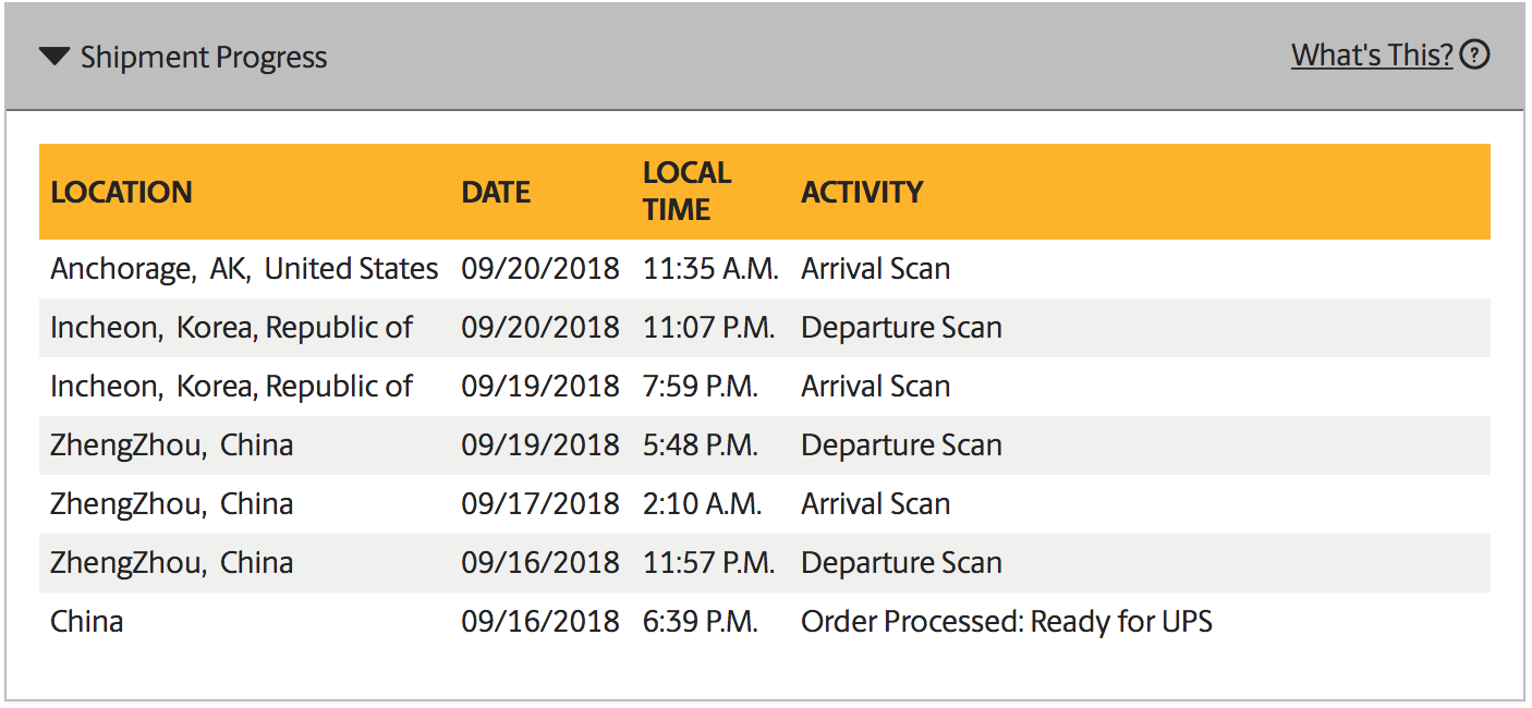 China 09/17/2018 3:43 P.M. Order Processed: Ready for UPS