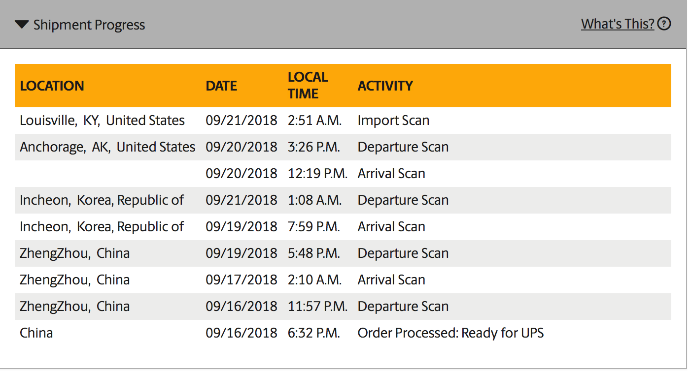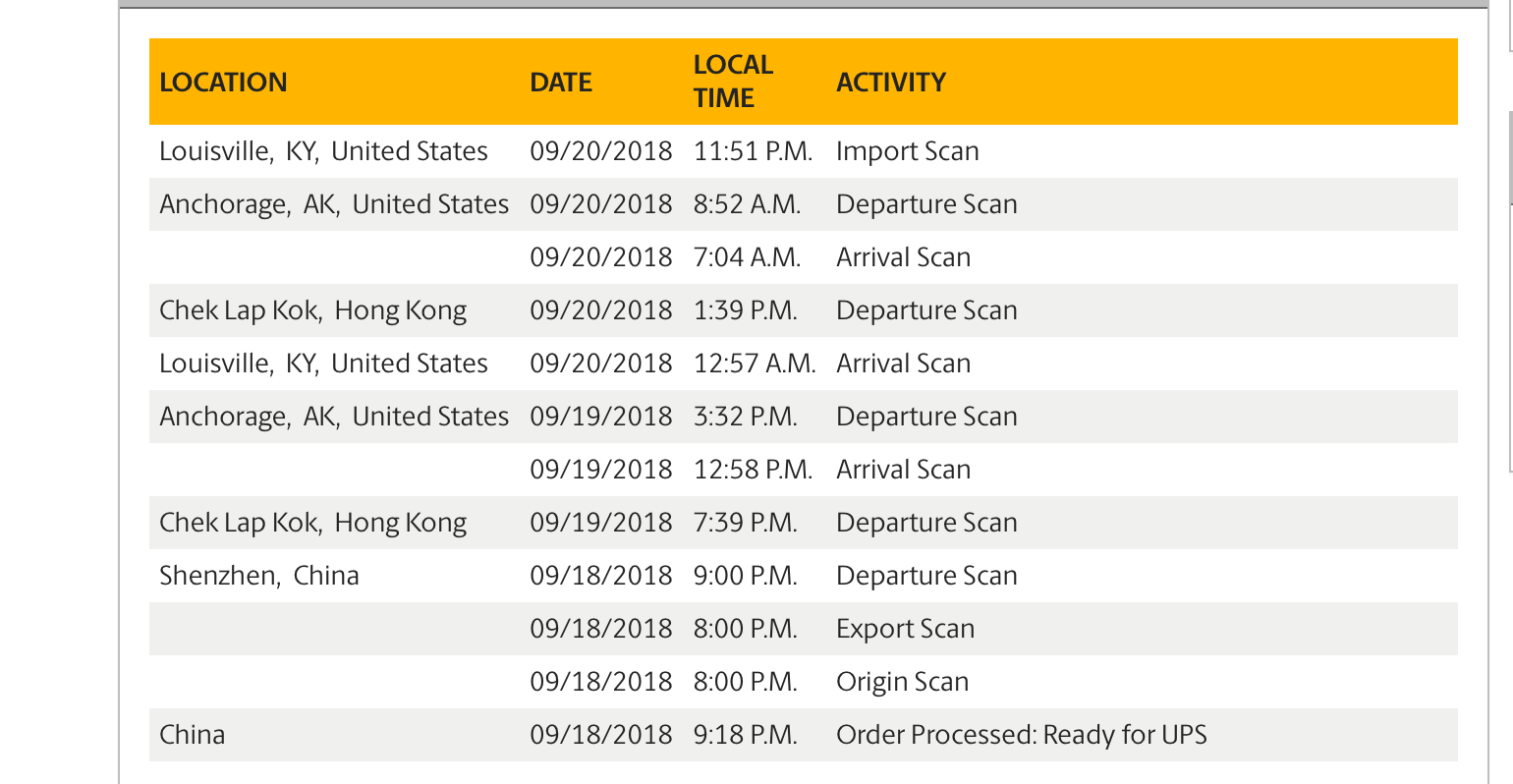 The 3:26 departures only landed within the past 45-60 min or so. Remember the packages have a lot to do between landing and getting sorted to the destination city. The next flight out of SDF to my airport (MSP) is in just under 2 hours. It'll get to MSP and to my local UPS hub in time. I've seen this before. We'll be fine!Mine hasn’t been updated either since leaving Anchorage @ 3:26, but I’m hoping the scans are just not updating every hour or so like they should.