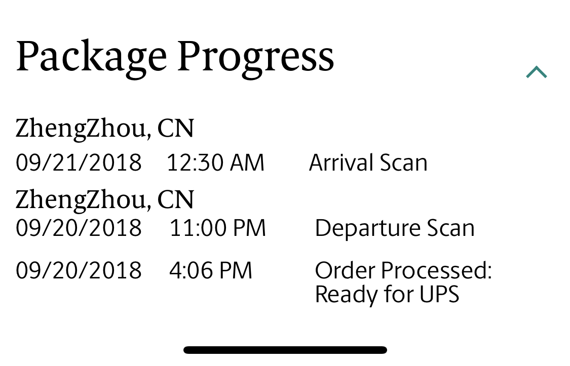 ZhengZhou, China 09/19/2018 10:24 P.M. Your package is in transit. We're updating plans to schedule your delivery.