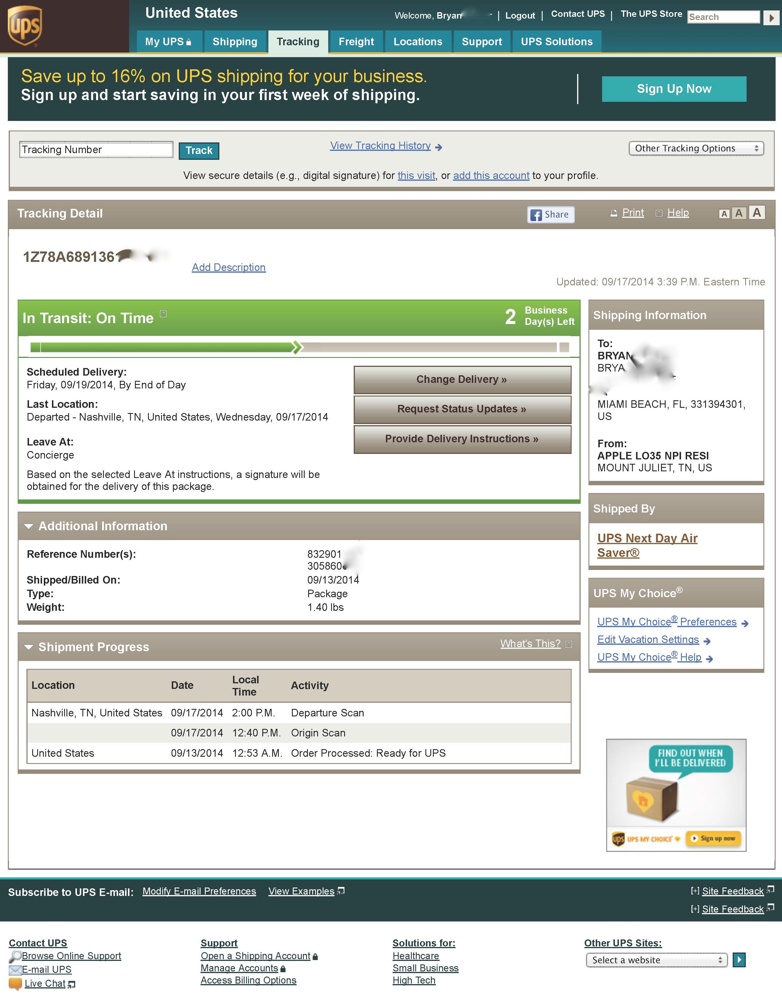 - Phone showed up on Apple support and UPS on 9/16 for delivery on 9/19 (from Apple)