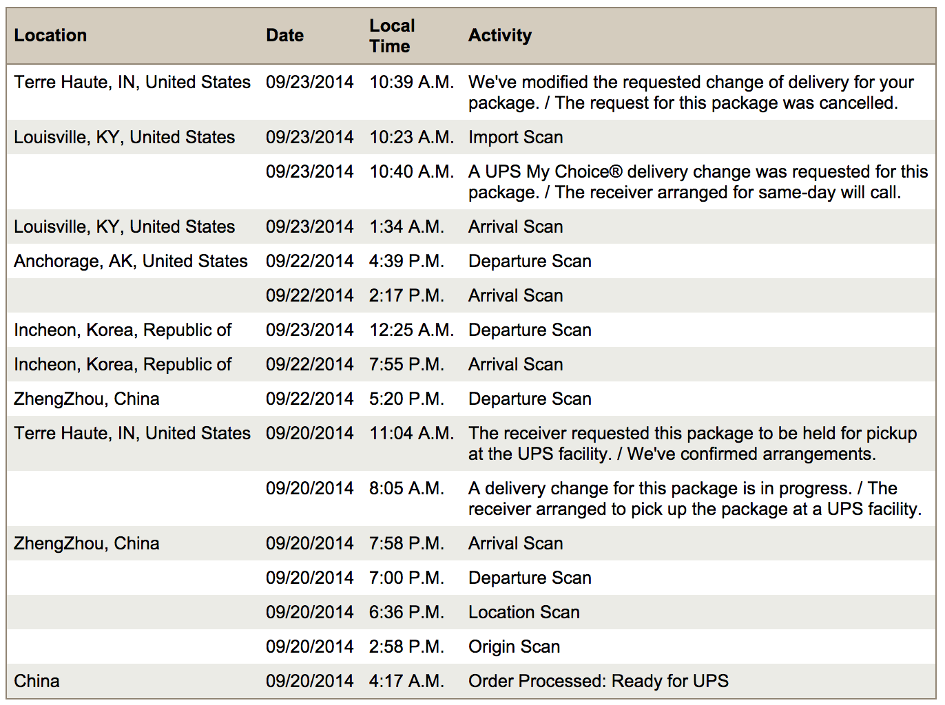 09/22/2014 9:15 A.M. A UPS My Choice® delivery change was requested for this package. / The receiver arranged to pick up the package at a UPS facility.