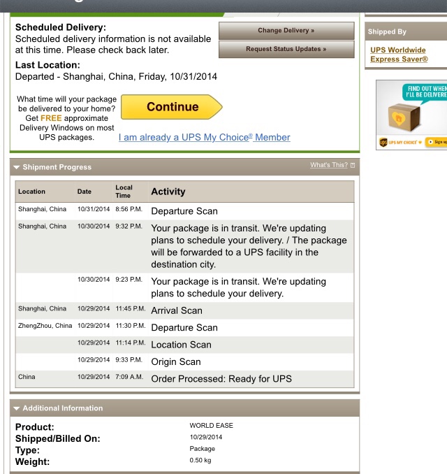 Incheon, Korea, Republic of 10/30/2014 9:00 P.M. Your package is in transit. We're updating plans to schedule your delivery. / The package will be forwarded to a UPS facility in the destination city.