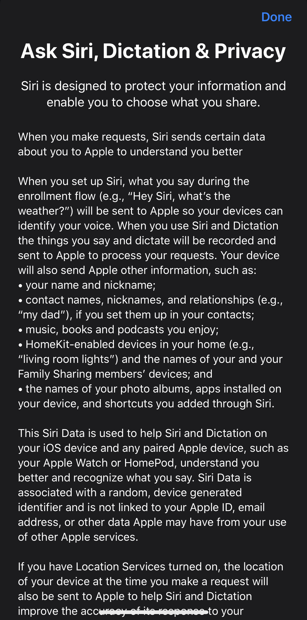 And that is why right “under enable” Siri there is a link about privacy. Being consumer friendly and having a comprehensive tos are not mutually exclusive. And ones definition of “consumer friendly” is a sliding scale.Apple prides themselves on consumer friendliness. What you’re saying here is the opposite of their mantra.