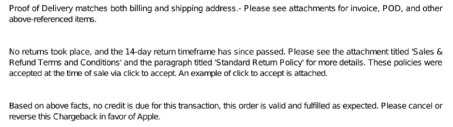 proof of delivery is present, and additionally, it mentions that no returns were made within the 14-day return timeframe. The bank or credit issuer also states that the "order is valid and has been fulfilled as expected."
