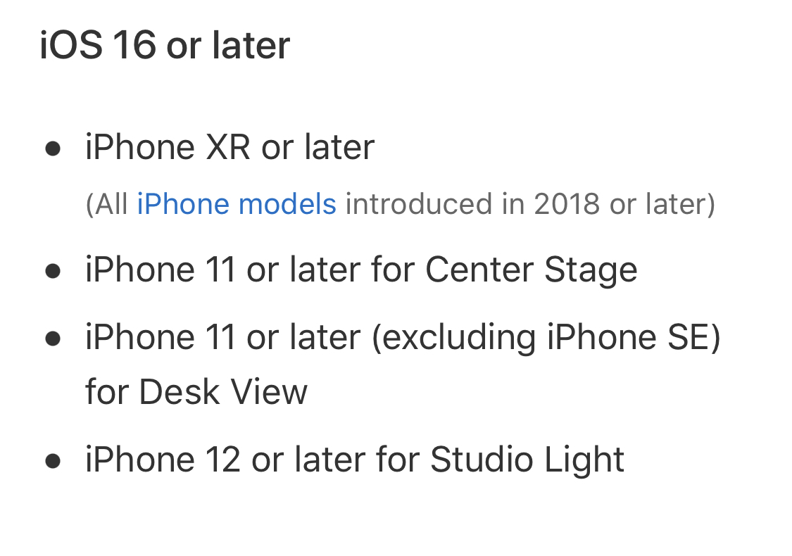 Is there a minimum iPhone requirement other than iOS16? I guess iPhone 11 for the deskview / centre stage feature by way of the ultrawide lens, but will iPhone 8, X, XS, XR, SE (2md/3rd gen) work as a basic webcam?