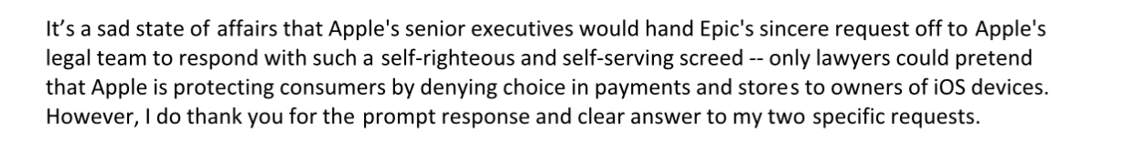 And, as we now know, Epic had already produced the 1984 parody video, got the legal cation ready AND had the new code installed and waiting to be triggered BEFORE Apple received the letter.