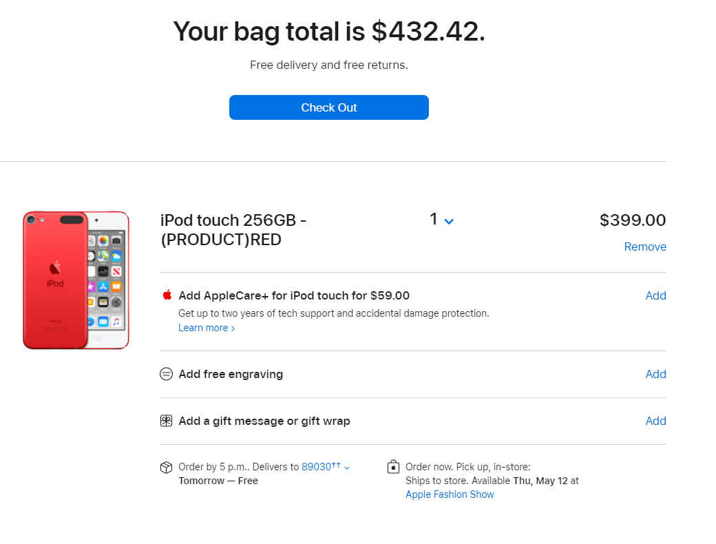 The seventh-generation iPod touch is priced starting at $199 and it features a 4-inch display with thick bezels, a standard Home button with no biometric unlocking mechanism, and an A10 Fusion chip. It is available in Pink, (PRODUCT)RED, Space Gray, Silver, Gold, and Blue.