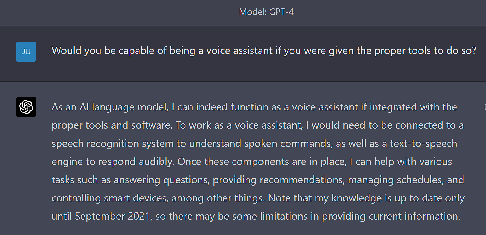 The bold part was my point. ChatGPT can be used in nearly limitless scenarios…if developed into them.I think you've led yourself to minimize ChatGPT's abilities based on how it has been described to you. ChatGPT can do literally anything a voice assistant can do if it had access to the API calls to do so. Do you honestly believe that an AI that can mimic being a Linux csh interface just because you asked it to would not understand commands such as "Unlock the front door" and know to send that request over to HomeKit?