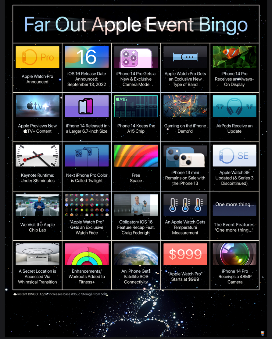 Apple's "Far Out" event kicks off today at 10:00 a.m. Pacific Time, where we're expecting to see the iPhone 14 lineup, several new Apple Watch models, updated AirPods Pro, and perhaps some other announcements.