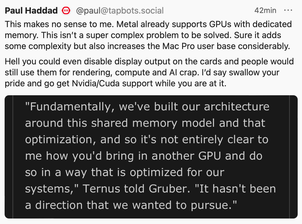 If loop in the iPad (**) with plain M-series now the 'experience' is more like 99.96% vs 0.04% even if Apple had looped only the Mac Pro (plus some odd ball eGPUs that were left) in. If round that to one digit after the decimal point its 100.0% to 0.0%