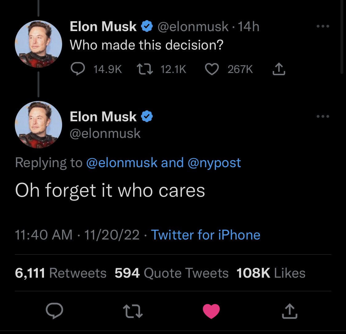 For the record, I'm staying. A lot of people I like are on Twitter and are also staying. I'm genuinely worried for the future of the platform though, because Musk seems to be making huge decisions that don't make any sense.Snowflakes and Bunny Hill babies are bothered by Musk now when they used to love him. Apple has no standing to judge others and Schiller is just a spoiled brat trying to play to his audience. If you have courage and principals you stay and model the behavior you believe in, you do not run away tossing pejoratives (implied or stated) over your shoulder.