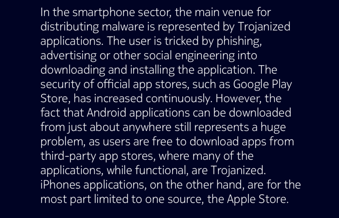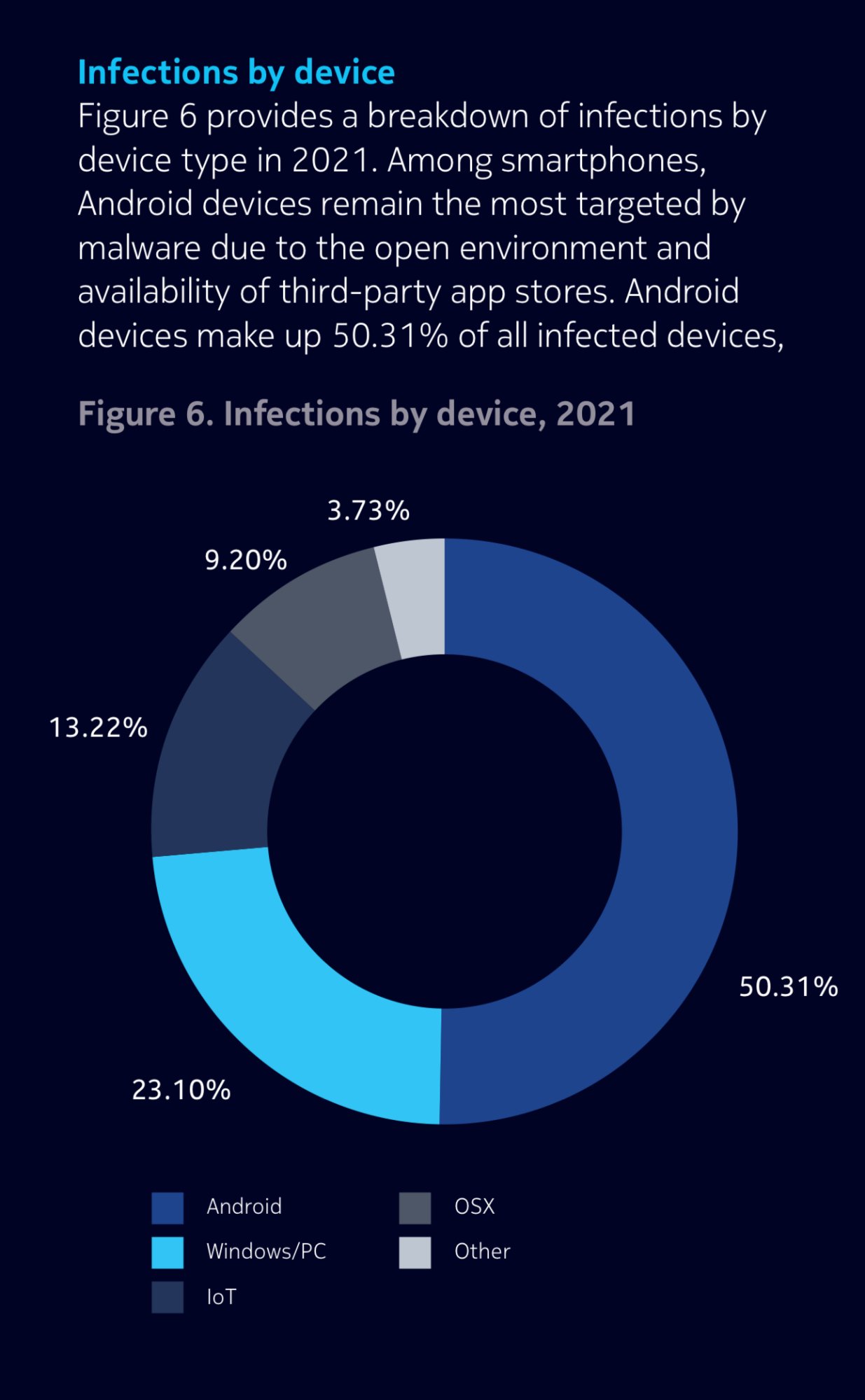 Android consistently accounts for half of all infections on all devices and it's consistently pointed out that the biggest contributor to this is the availability of alternative app stores that host trojanized banking apps (see attached).