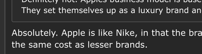 No. Apple is a premium brand. Not a luxury brand. Where did I agree it’s a luxury brand. B&O is a luxury brand. Which I gave as an example.You agreed with a post calling Apple a luxury brand ... Nike is not a luxury brand