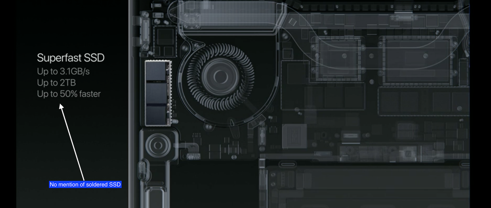 why doesn't Schiller say the SSD is soldered to the motherboard and NOT upgradable-