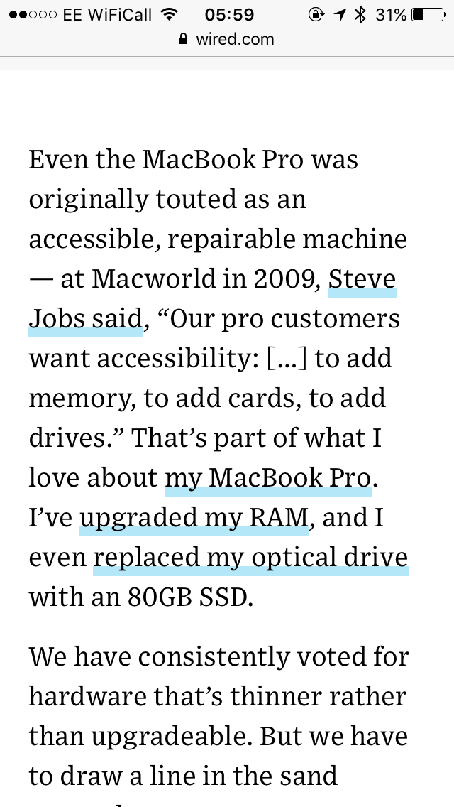 The thing is, no one I know who owns an MacBook really care much about upgradability. Because its rather high second hand value you could buy a new machine, and when needed sell the old and buy a newer or better speced.We have to draw the line in the sand when we know the P**S is being taken by APPLE.