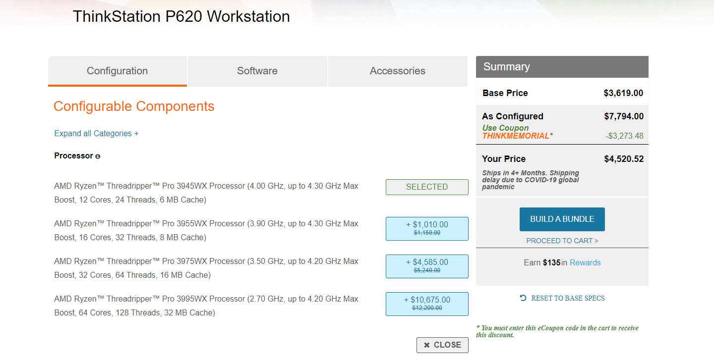 I just got a quote back from Lenovo for 10 P620 workstations. 3945WX (12 core) CPU, 128GB of ECC RAM, 1TB PCIe4 NVMe with plenty of room for SATA drives, RTX Quadro A5000 with 24GB of VRAM, wired keyboard and mouse. Each unit came to $4150 with a three year next business day onsite service warranty. And just like the Mac Pro, they will be "Assembled in the USA".