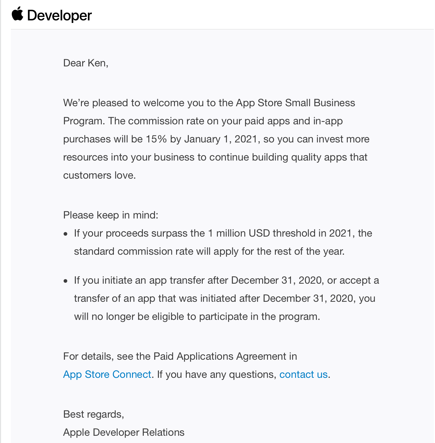 I received a notification from Apple today advising that my application for the App Store Small Business Program has been successful. Personally I never had any issue with the 30% commission, but obviously I am happy to pay the lower commission of 15%. One thing that I wanted to bring up that I haven't seen discussed is iTunes/App Store cards bought in brick and mortar stores. Other than Apple Stores, any store selling iTunes gift cards would have to be making some amount of profit, otherwise why would they bother? iTunes gift store cards are always on special at one store or another as well. It is important to note that any cost Apple has in relation to iTunes card sales prices or just iTunes card purchases in stores in general comes out of Apple's commission, not the app developers revenue. So if a customer purchases an iTunes card for 20% off, and uses that iTunes card to purchase my app, I still get the same commission, regardless of that fact that the user paid 20% less for my app because they purchased an iTunes card on sale. This will still be the same now that I am only going to be paying Apple a 15% commission.