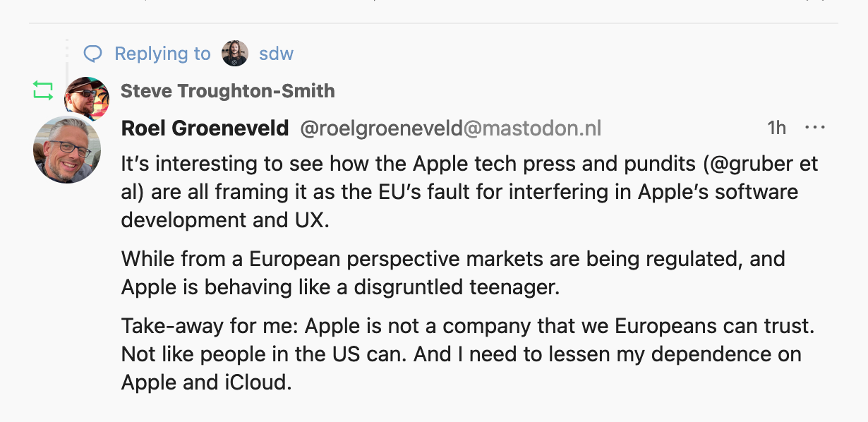 Honest question: why does it seem most of Europe have such trust for Meta/Facebook? While of course popular in the US to varying degrees, there is also an underlying “Do NOT trust Meta” vibe here. In the US if you asked me to use Facebook anything (Messenger, WhatsApp) I’d laugh and ask what cut Zuckerberg is giving you.I suppose it's mostly US users who can't believe it but I'm also very strong in my wording. The market here is a lot more flexible, regardless of whether the EU is the problem or Apple in this case. I believe they share blame and nobody is really guilty - Apple has a right to defend their interests that should be treated with respect, regardless of whether they're an European, American or Chinese company.