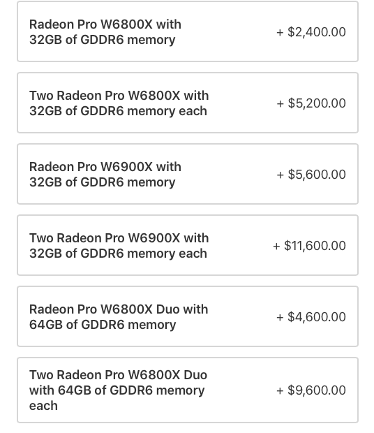 For customers who already purchased a Mac Pro, Krol said the new graphics modules will also be available on a standalone basis through Apple's online store, but the product listings have yet to go live, so pricing remains to be seen.AMD Radeon Pro W6800X