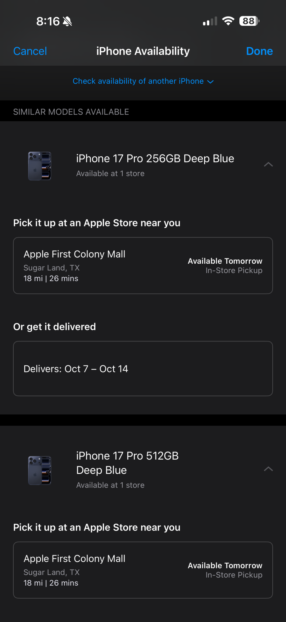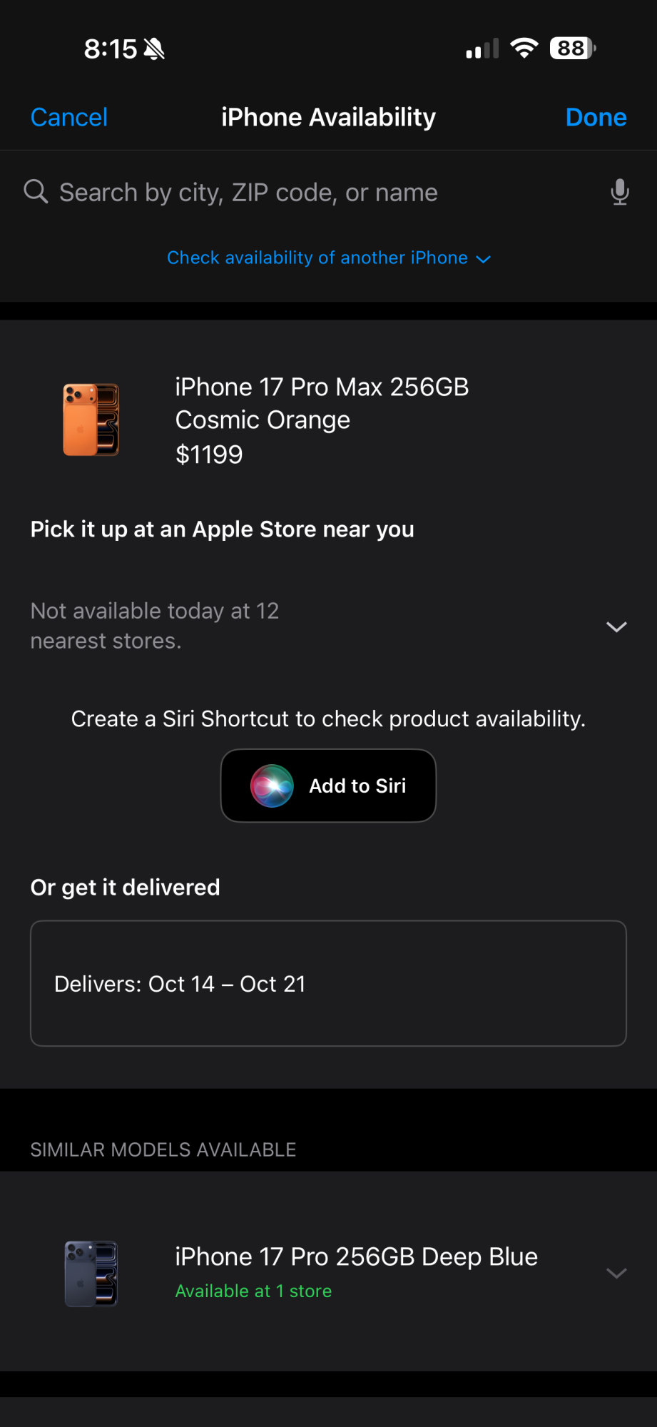Hahaha — yup, been trying to get one for the last few days.My iPhone 17 Pro Max Orange 256GB is not available on any of the 7 Apple Stores in Houston.