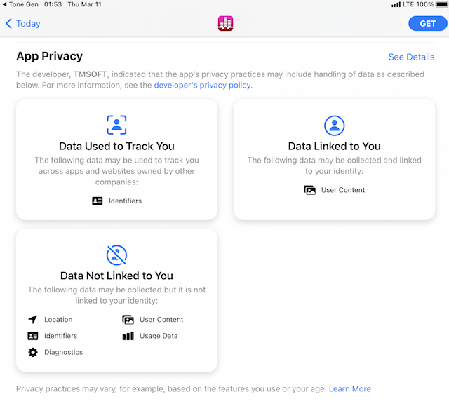 Apple introduced privacy labels on the App Store in December, providing users with a broad overview of the data types an app may collect, and whether the information is used to track them or is linked to their identity or device. These labels appear in App Store listings for third-party apps and downloadable Apple apps like Apple Podcasts, while built-in apps that cannot be removed like Messages have labels on Apple's website.