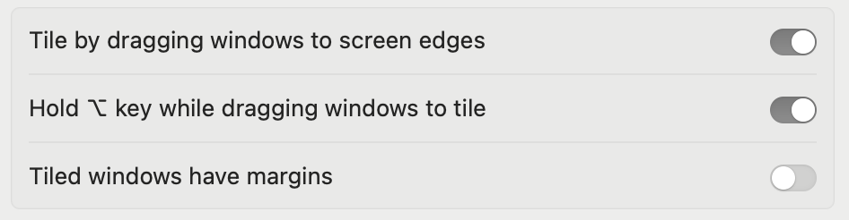 Literally no idea what you're talking about. You can turn window tiling off just fine in System Settings > Desktop & Dock and can get rid of the extra margins there as well.The window tiling functionality is just another stupid evil design by Apple. It literally wastes space, makes your content less easy to focus on.