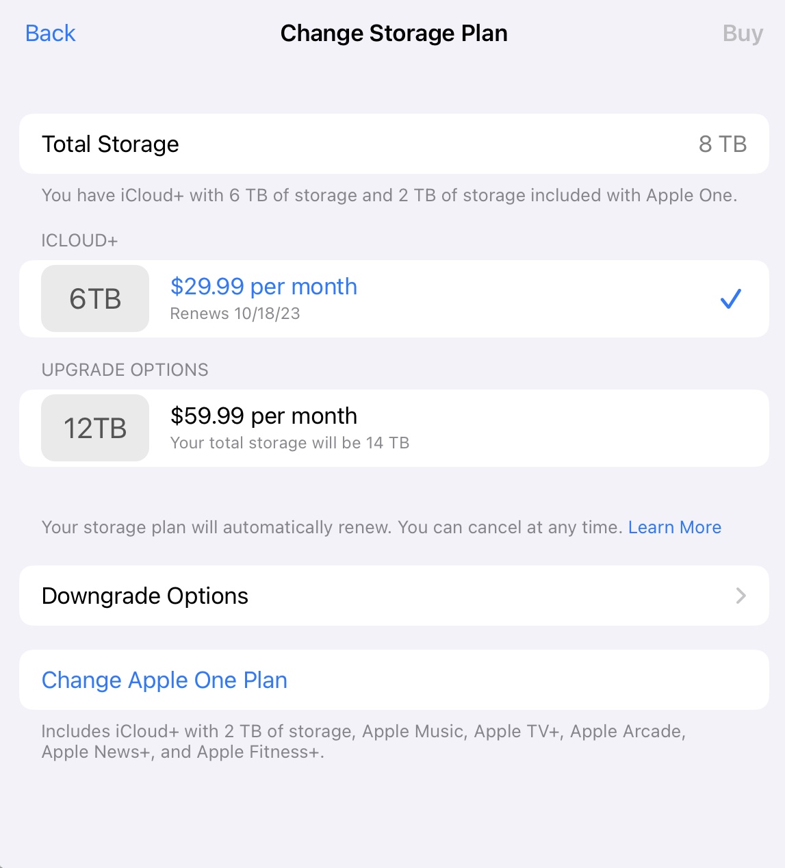 Did it add your Apple One storage to the 6TB? I had 4TB from iCloud+ 2TB and Apple One Premium 2TB and when I upgraded iCloud to 6TB it did not go to 8TB.I just bought the 12tb, made an account to respond to this of the people wondering why so much for 12tb. I do photography and record lots of XAVC SI videos. I need the storage space. my pc has 13tb and MacBook as 1tb. I own an external SSD of 4tb. IT fills up and quickly. I personally chose to upgrade from 2tb to 12tb + apple one with 2tb to a total of 14tb, 2tb already fully used. I need the extra storage. I edit lots of videos and photos so. I personally like it. Apple isn't forcing anyone to go higher TB just stick with 2tb. just I and other people that use a lot of storage just need it;plus I do like how Easy it is for me to plug my camera cfexpress card to my iPad Pro and just sync it to my iCloud which is now on all my devices including my windows pc when using iTunes iCloud app