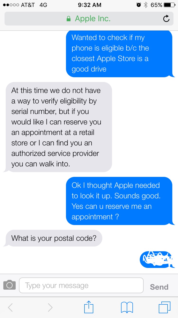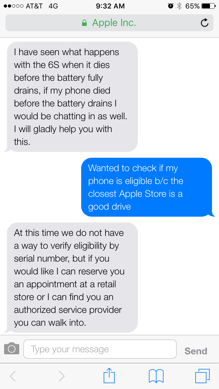 Chat: If you have experienced this issue, please visit an Apple Retail Store or an Apple Authorized Service Provider and have your device's serial number checked to confirm eligibility for a battery replacement, free of charge. Lets see if we could find a service facility close by. What is your postal code?