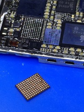 Yep. Here's what happens. Many of today's chips have so many connectors, that they're placed underneath in what's known as a BGA (ball grid array). Here is the touch controller desoldered from its pad on the board: