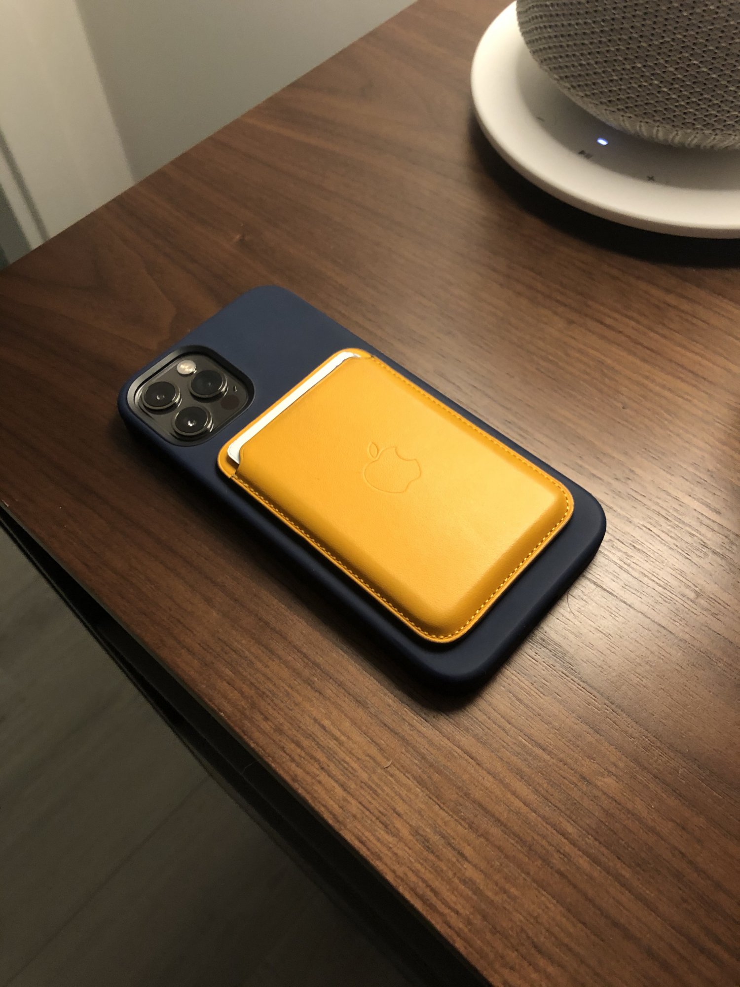 Graphite iPhone 12Pro + Blue silicon case + California poppy wallet.