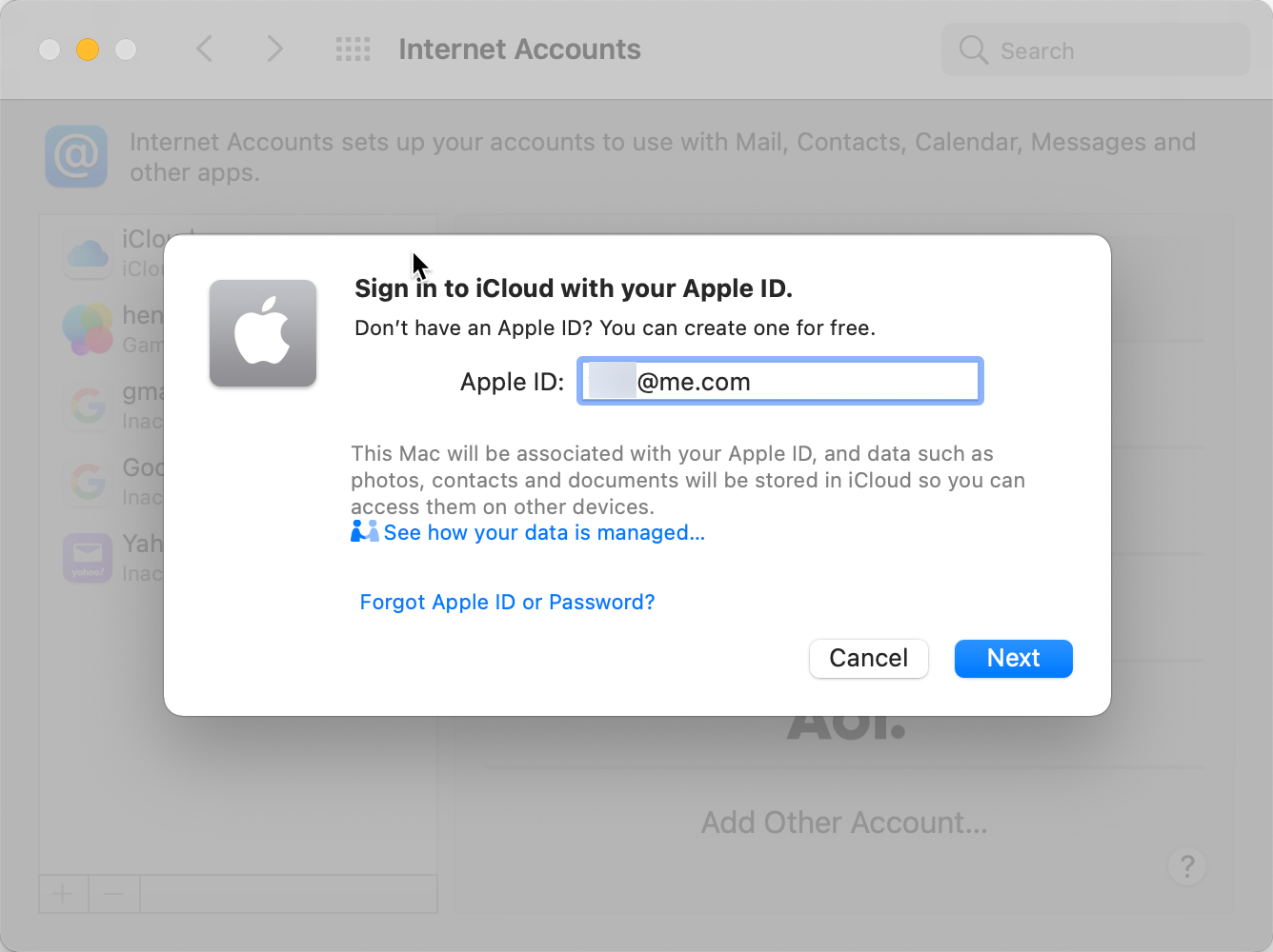 I only use the ***@me.com as a mail account since 2000 (updated, typo) to get access to Mail. Mail works fine on my MBP16. On my M1, I tried to add the same **@me.com to get access to mail on M1. I get the following screens sequence, regardless of whether I add an internet account or go to I forgot. This is what happened:
