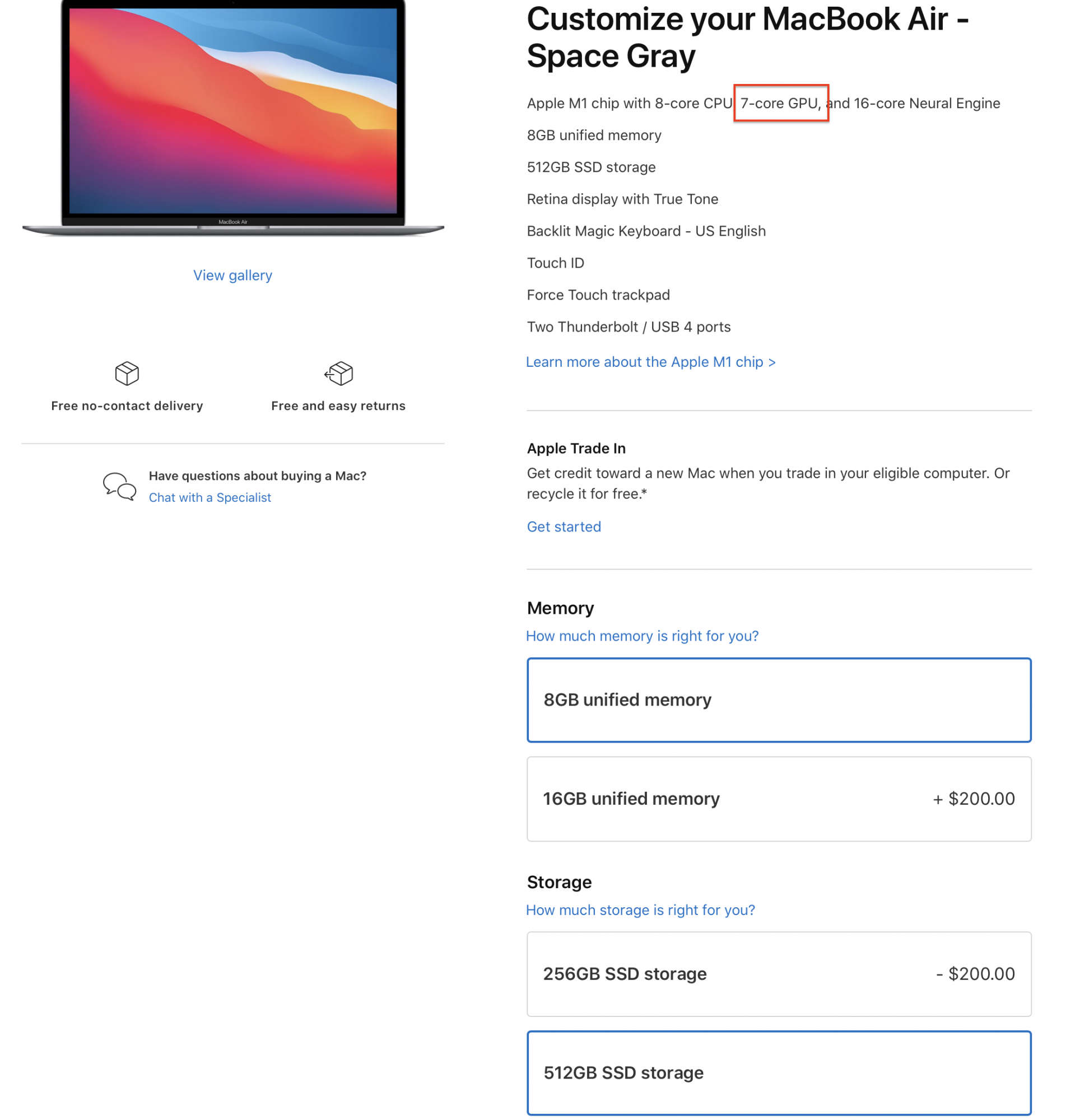 The entry-level MacBook Air has a 7-core GPU while the entry-level MacBook Pro has an 8-core GPU, which is why the price is a bit higher. If you get the 512GB SSD with the MacBook Air, you get upgraded to that 8-core GPU automatically.
