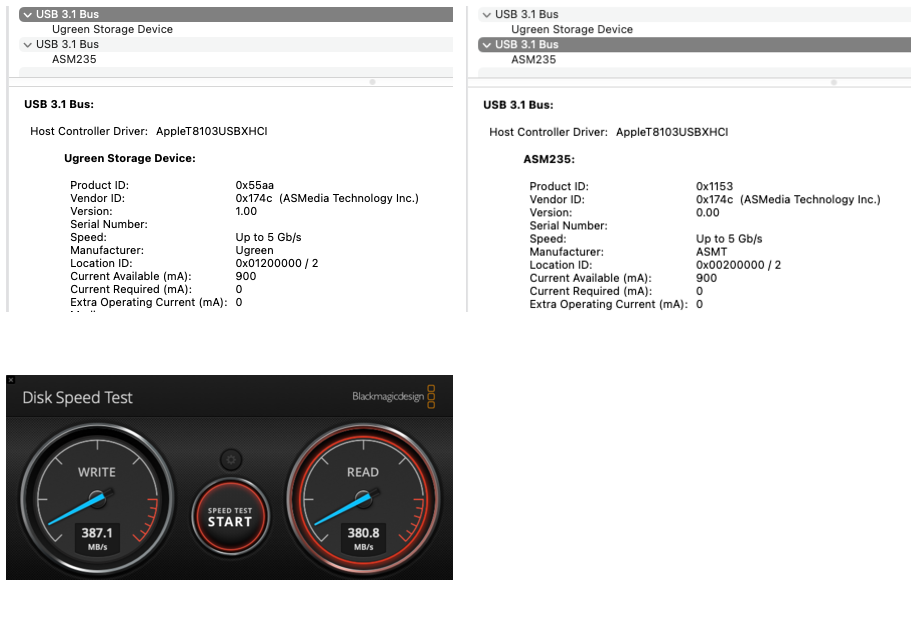 2) USB 3.1 Gen 2 Enclosures detected at 5 Gbps speed instead of 10 Gbps. So instead of the ~520 MBps Read and ~490 MBps Write Speeds, I am only getting ~380 MBps Read and ~390 MBps Write Speeds. Enclosures used are USB 3.1 Gen 2 models by Cable Matters and UGreen. Apparently, both use the ASMedia chip that is used in Samsung T5 as well. This issue has been reported in much more detail here