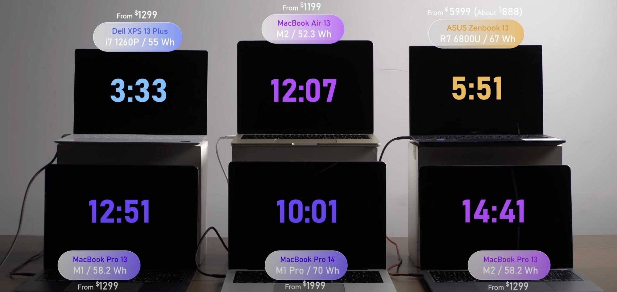Geekerwan also compared the M1 and M2 to other Windows based systems and shows that the M2 MacBook Pro actually achieves higher battery life than the M1 MacBook Pro on their script based battery life test. Their battery test is based on 1 hour cycle that streams music constantly, 10 minutes each to Microsoft Office (Excel, PowerPoint and Word), 10 minutes web browsning, 10 minutes online video streaming in 4K and 10 minutes of instant messaging.