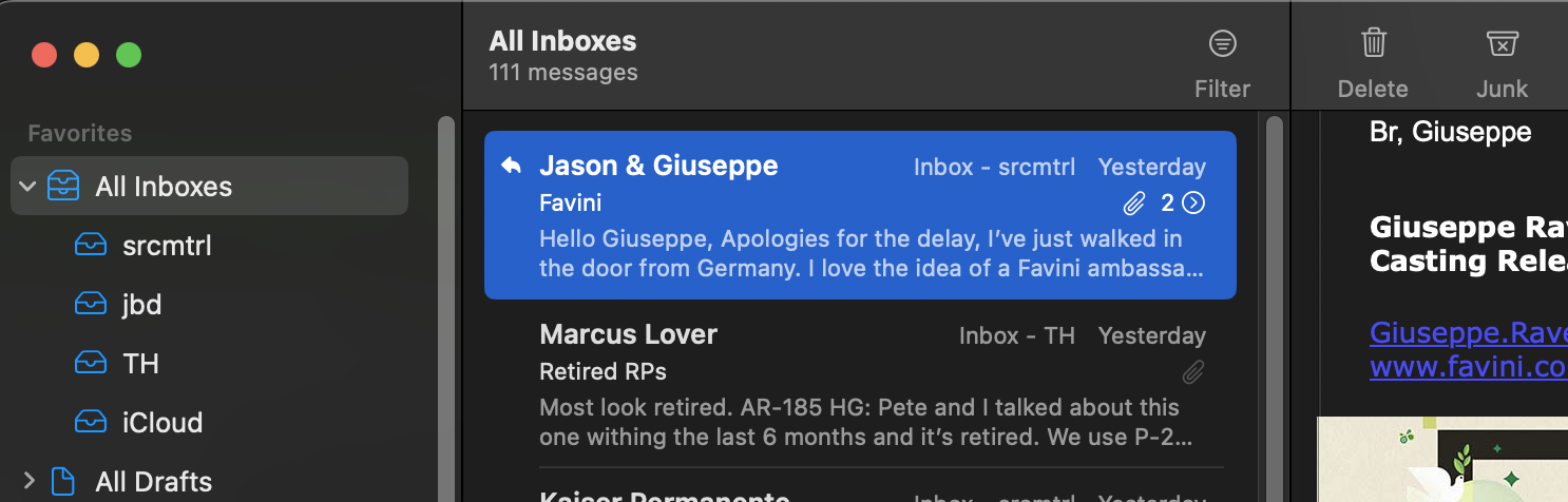 There’s a bug in Apple Mail that “randomly” deletes emails - locally and on the server. Completely. It’s been going on for years and drives me CRAZY. It just seems to happen randomly. I live in email, it’s where I work. So Mail is open with an email that I’m reading as I’m making changes in Illustrator, Excel, After Effects, or whatever. Making changes, sips of coffee, going back to the email, more sips, back to the email, but is GONE. Nowhere to be found. Anywhere. And this repeats, sometimes daily, sometimes monthly, for at least five years.