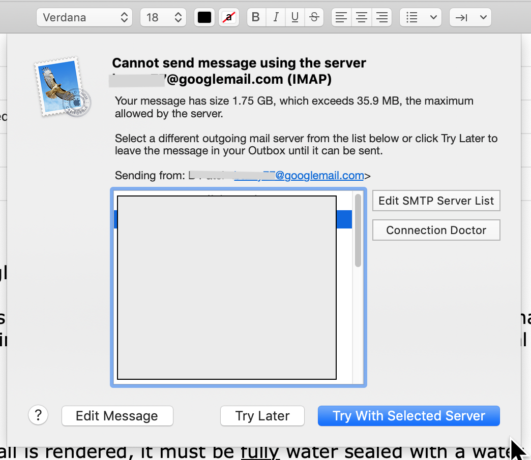 Whenever I try to send large attachments in emails now, after pressing the send icon, I get the message above & I press continue. At that point my computer just goes haywire - fans rev up to Max, temps skyrocket & the mail CPU usage gets to 200% - everything freezes, cursor does not work & spinning beach balls galore that last ages. The RAM is maxed out every few seconds like to 0.1% before the system tries to free up but it instantly gets eaten up again & this cycles just continues.