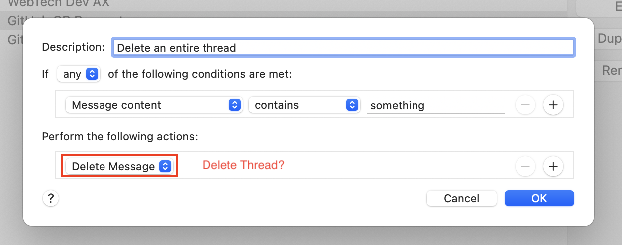 Do you know if it's possible to delete an entire thread of messages if given conditions are met for a single message within this thread? For example if any of the messages in the thread contains "something" in the content, then delete the entire thread. Since all predefined options for "Perform the following actions" are only related to a specific message, I suspect, the only way would be "Run AppleScript". I'm not really an expert in AppleScript - do you know if it's possible to do that? Thanks.