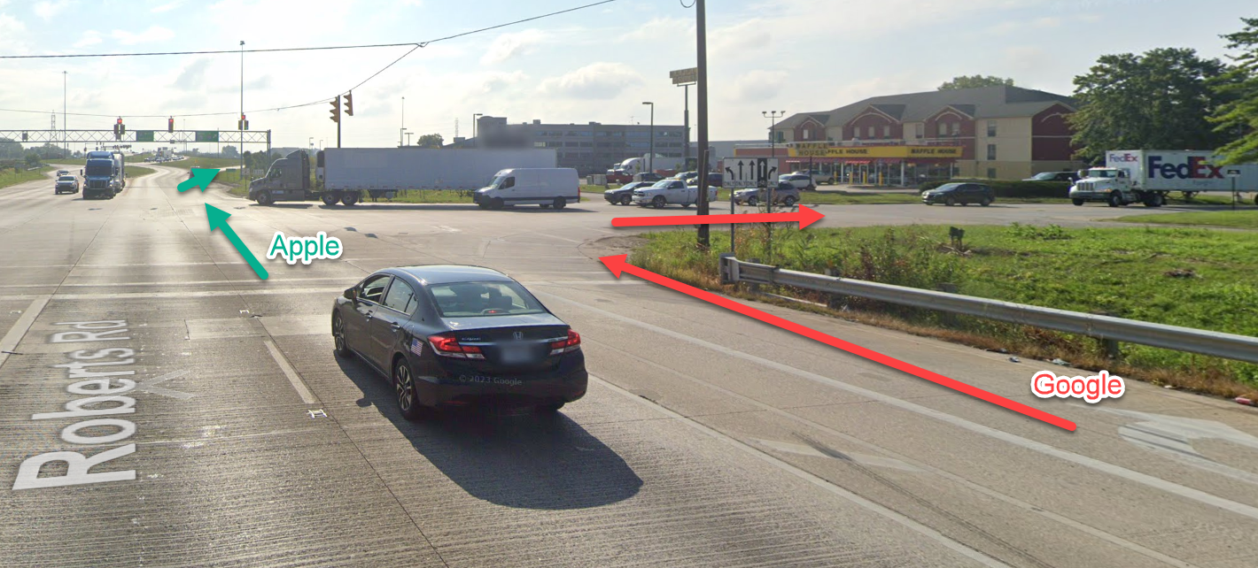 To give more information on what I mean, here is one example. As I'm pulling up near this intersection, Google will tell me to "Take a right at the light", which is NOT accurate for the route I'm going. However, Apple will say, "Go through the light, and then a slight right", which IS correct.