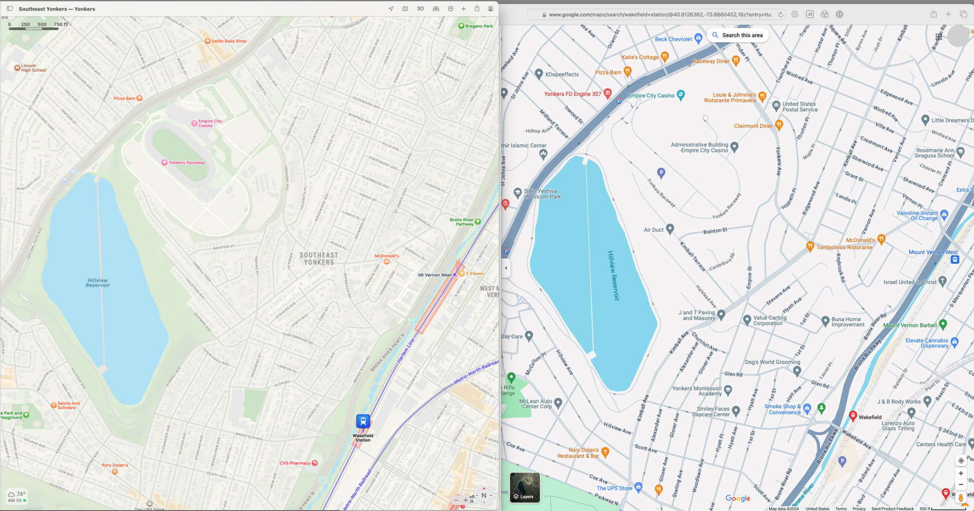 I think this is pretty representative. Google's map has more business info, which is clearly their strength, but the map itself is ugly, cluttered, and is missing a lot of detail that Apple has.